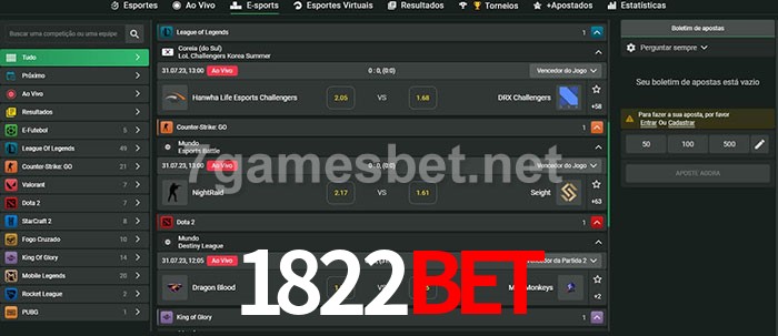 O 1822Bet oferece uma grande seleção de opções de apostas em e-sports com probabilidades competitivas
